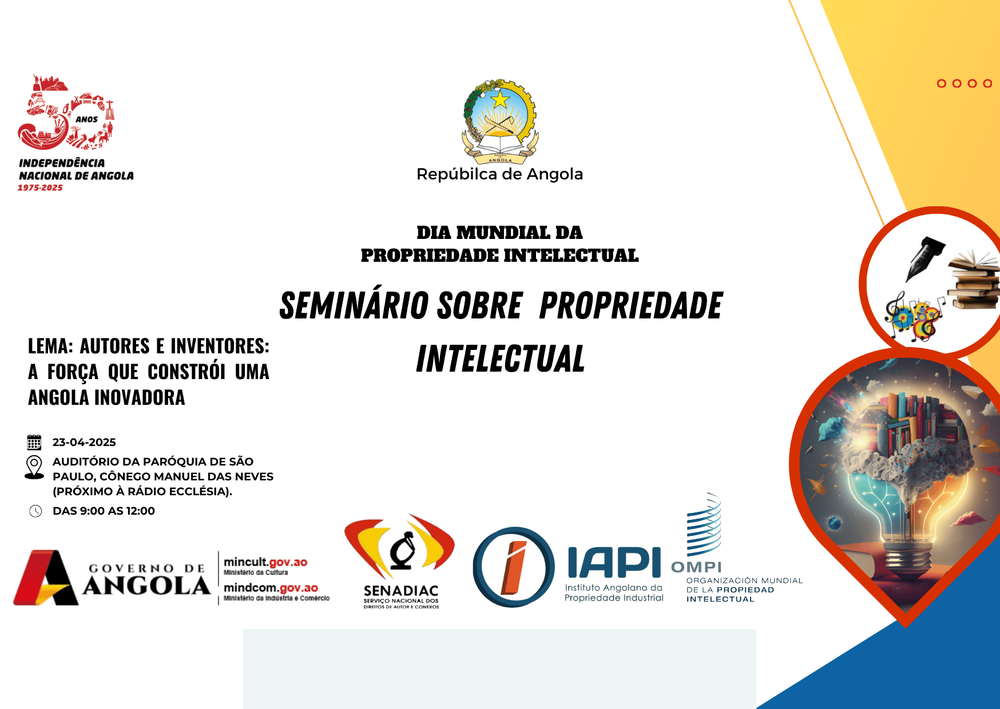 Em alusão ao dia mundial da Propriedade Intelectual, que se comemora no próximo dia 26 de Abril, o Instituto Angolano da Propriedade Industrial (IAPI) e o Serviço Nacional de Direitos de Autor e Conexos (SENADIAC) realizam o Seminário sob o lema “AUTORES E INVENTORES: JUNTOS CONSTRUÍMOS UMA ANGOLA INOVADORA”, no dia 23 de Abril, no auditório da Paróquia do S. Paulo, junto a Rádio Ecclésia, em Luanda.